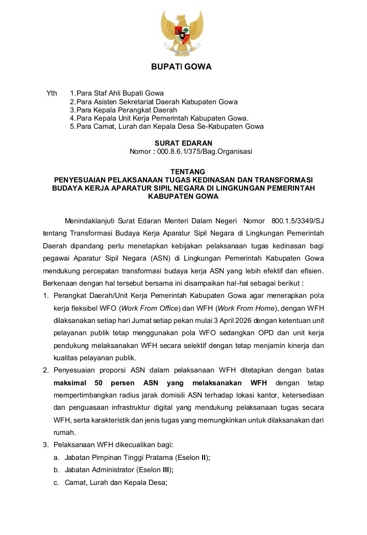SULSELNEWS.NET——Aparatur Sipil Negara (ASN) Pemerintah Kabupaten Gowa akan mulai memberlakukan bekerja dari rumah atau Work From Home (WFH) setiap pekan pada hari Jumat.