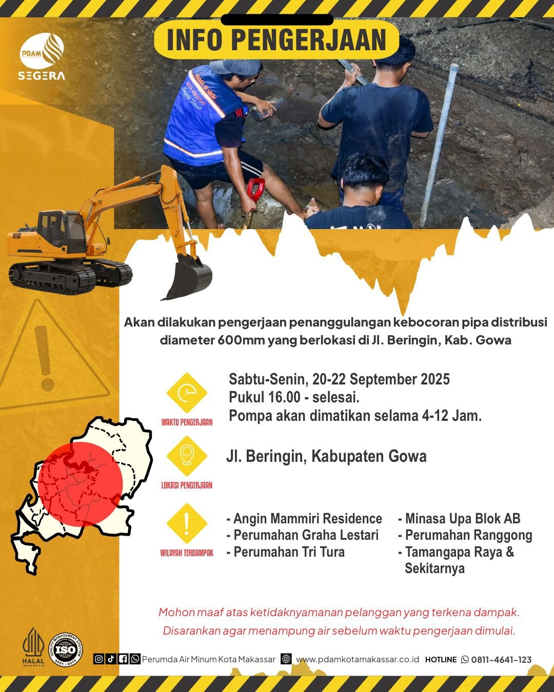 Kepala Bagian Distribusi dan Kehilangan Air Bersih Perumda Air Minum Kota Makassar, Rommy Arief Derianto, menjelaskan: “Proses pengerjaan membutuhkan waktu estimasi tiga hari sejak penggalian hingga selesai, namun untuk penghentian air ke daerah terdampak kami estimasi hanya 1 x 24 jam saat proses pemotongan pipa dan penyambungan alat bantu. Jika tidak ada kendala di lapangan, distribusi air bisa lebih cepat kami pulihkan,” ujar Rommy, Jumat (19/9/2025).