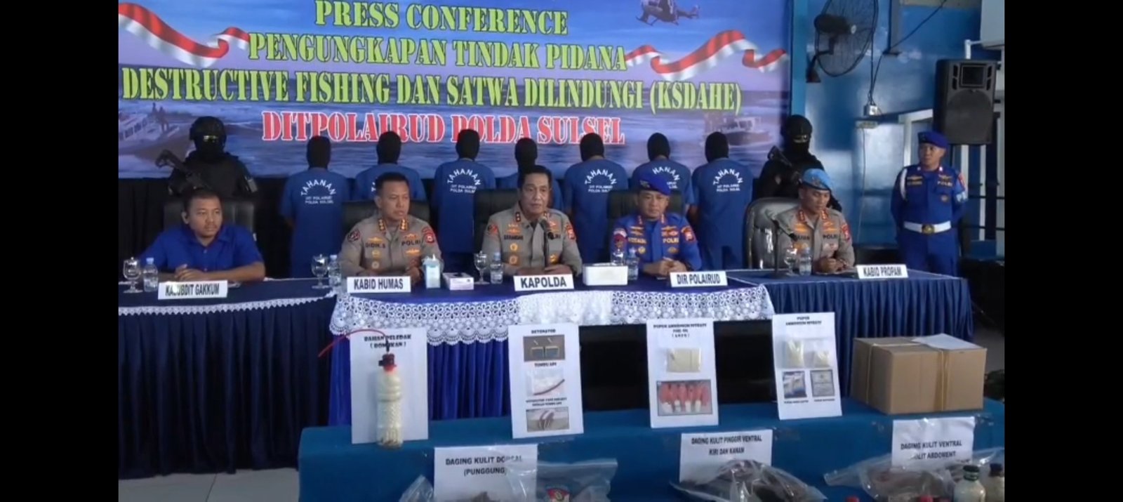Dalam operasi tersebut, Ditpolairud juga menyita barang bukti berupa ratusan bom ikan, pupuk urea dalam jumlah besar, kompresor, alat selam, dan karung berisi potongan penyu hijau kering.