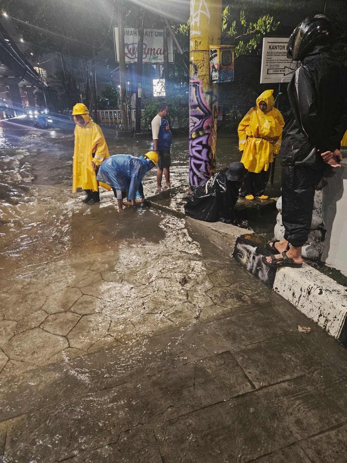 Di tengah guyuran hujan dan genangan yang masih mengalir, petugas Satgas bekerja membersihkan saluran drainase dari tumpukan sampah dan sedimen yang menyumbat aliran air.