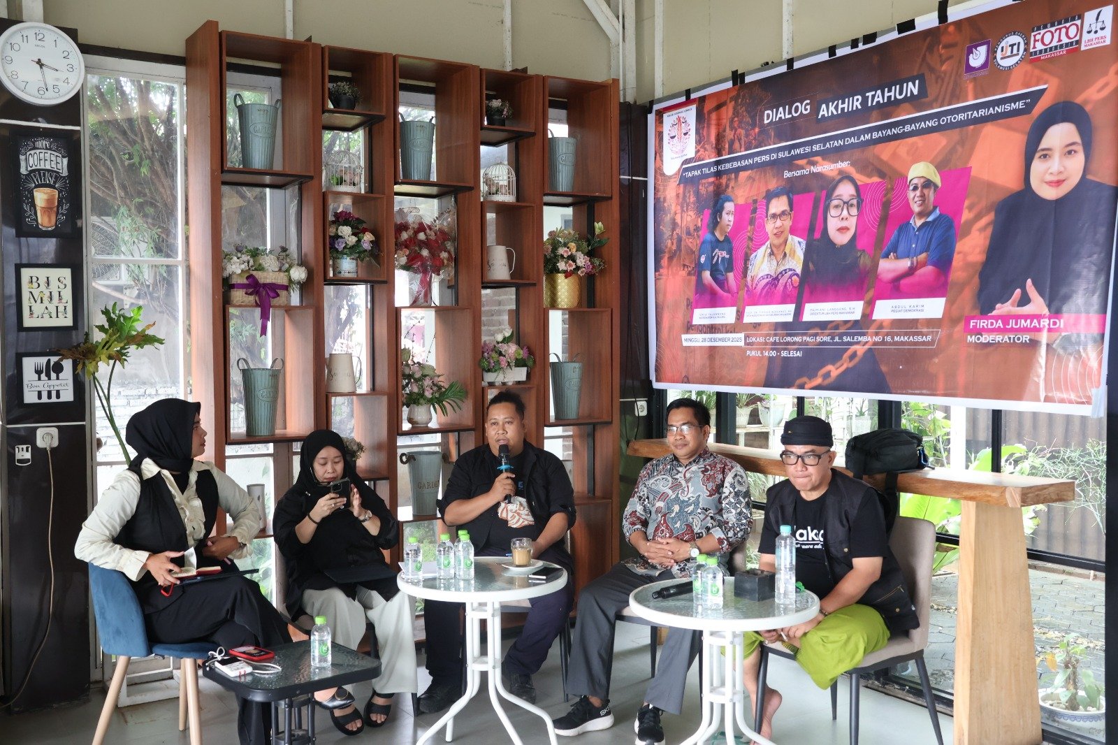 Kegiatan ini menghadirkan empat narasumber, yakni Koordinator KAJ Sulsel Idris Tajannang, Direktur LBH Pers Makassar Fajriani Langgeng, Ketua Majelis Etika AJI Makassar Abdul Karim, serta Guru Besar UIN Alauddin Makassar dan pegiat demokrasi Prof Firdaus Muhammad. Diskusi dipandu jurnalis Firda Jumardi.