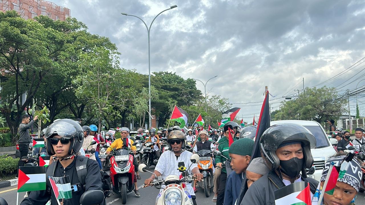Lautan massa mewarnai jalan protokol Kota Makassar. Peserta rata-rata membawa dan mengenakan atribut Palestina, seperti bendera, topi dan syal.